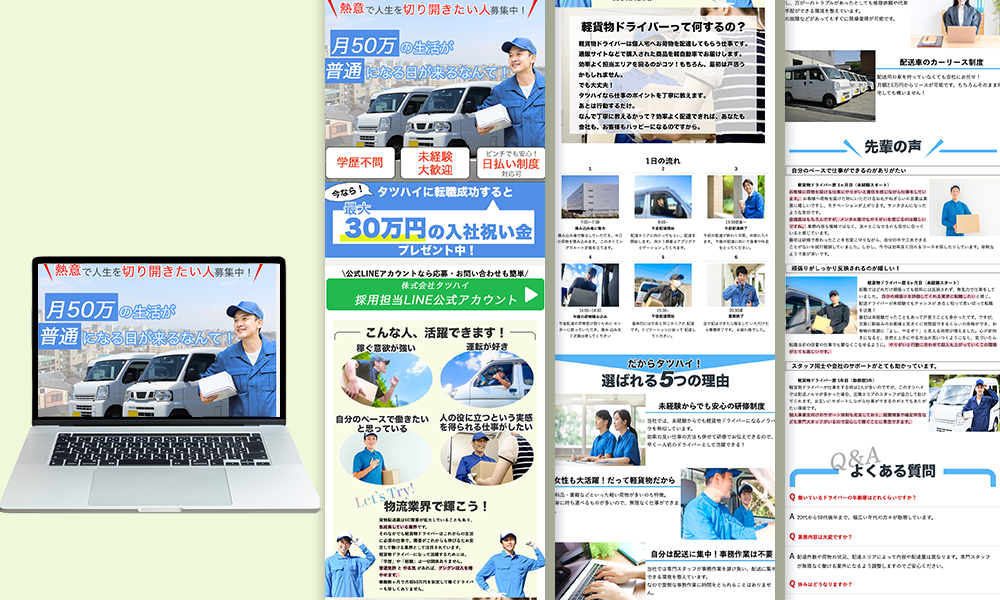コストを抑えてWeb集客をしたい個人事業主・中小企業の方へ コストを抑えてWeb集客をしたい個人事業主・中小企業の方へ LPの目的は見てもらうことではなく、「行動してもらうこと」。当サービスでは、消費者心理・セールスライティングのノウハウを活かし、購買意欲を高めるLPを制作します。文字の配置、色、キャッチコピーの見せ方、画像の選定など、細部にこだわったデザインで、反応を引き出すLPをご提供します。 当サービスはで長さ制限なし&修正無制限のパッケージ価格だから、途中で料金が変わることなく安心してご利用いただけます。「修正ごとに追加料金が発生」「原稿が長くなって費用が膨らむ」といった心配はありません。明瞭な料金体系で、予算オーバーの不安をなくし、納得のいくLP制作が可能です。 一般的な制作会社では、営業・ディレクター・デザイナーが関わるため、その分コストも割高に。当サービスでは、LP専門のWebデザイナーが直接制作を担当することで、余計な中間コストを削減。高品質なLPを低コストで提供しながら、スムーズなやり取りとスピーディな対応を実現します。 依頼内容 子供向け体操教室の新規スクール生募集のためにLPを作成したい。 ターゲット 健康的で前向きな子供に育って欲しい母親と、運動が好きな小学生。 重要購買要因(KBF) 楽しみながら運動能力、姿勢の向上・安全な指導環境 料金・立地・安心できる指導者、カリキュラム 制作のポイント 子供向けに明るく、丸みのある印象にして親子一緒にみられるページにしています。実績は具体的に示すことで権威生を出しつつ、人気だとアピール(バンドワゴン効果)。保護者様の声には笑顔の写真を大きく使い、安心感をアピールするとともに、ターゲットに近い集団の良い口コミを大きく掲載しています。(準拠集団) 依頼内容 こだわりの外壁塗装サービスの無料見積もり相談募集のLPを作成したい。 ターゲット 家の外壁の劣化が気になるので修繕したいミドル世代の夫婦 重要購買要因(KBF) 塗装の施工期間と品質・他のサービスとの違い・料金・実績・アフターサポート・安全性 制作のポイント ファーストビューは画像が自動で切り替わるようにして画像でメッセージを伝える工夫をしています。図解を交えて、通常の外壁塗装サービスのシステムと自社のシステムを解説することで納得感を持って読み進めてもらう工夫をしています。(リフレーミング)保護者様の声には笑顔の写真を大きく使い、安心感をアピールするとともに、ターゲットに近い集団の良い口コミを大きく掲載しています。(準拠集団) 依頼内容 集客ツールを有用性を伝え、お問い合わせに繋げるLPを作成して欲しい ターゲット 集客やマーケティングについて悩みを抱えるビジネスオーナー 重要購買要因(KBF) サービスの実績・仕組み・利用のしやすさ・サポート・コストパフォーマンス 制作のポイント BtoB商材ですが、Web操作に自信のない方をターゲットにしているのである程度イラストを使い、わかりやすくポップに。実績はできるだけ大きく見せる表現にし(ハロー効果)、申し込みボタン上部には大きくお得アピールをして申し込みしたくなるデザインにしています。(アンカリング効果) 多種多様なテーマにも対応いたします 安心の一律パッケージ 1案件150,000円(税込) 以下のサービスが料金内に含まれています STEP01:無料相談・お問い合わせ LP製作をご検討の方はお問い合わせフォームにてお気軽にご相談ください。内容を確認次第、24時間以内(土日祝除く)にご記入いただいたメールアドレス宛にヒアリングシートと請求書を添えて返信いたします。※制作に関する不明点は、お問合せフォームよりお気軽にご連絡ください。 STEP02:お申し込み・ご契約 ご検討の上、正式にご依頼が決まりましたら、事務手続き書類一式をお送りいたします。ご確認の上、制作代金のお支払いをお願いいたします。 STEP03:製作準備 ご入金が確認できましたら、概算のスケジュールと原稿作成テンプレートシートを送付させていただきます。原稿作成テンプレートシートのご記入と制作に必要な画像や動画とともに必要情報と共にご返送をお願いします。もし不明な点、制作に関する相談がありましたらお気軽にご相談ください。 STEP04:デザイン製作・コーディング いただきました情報をもとにLPの制作を開始いたします。仮制作が完了した段階で適宜ご確認をいただき、方向性のすり合わせとフィードバックをお願いいたします。問題がなければコーディング作業を進めさせていただきます。 STEP05:アップロード/データ納品 修正が完了しLP内容が確定後、必要なタグのhtmlデータへの埋め込み、バナー作成、お客様サーバーへのアップロードを行います。ご確認後、納品確認フォームをご記入いただき、納品完です。デザインデータが必要な場合、このタイミングでお送りいたします。 制作の相談について 対面でのご相談は可能ですか? zoom等のビデオ通話でのお打ち合